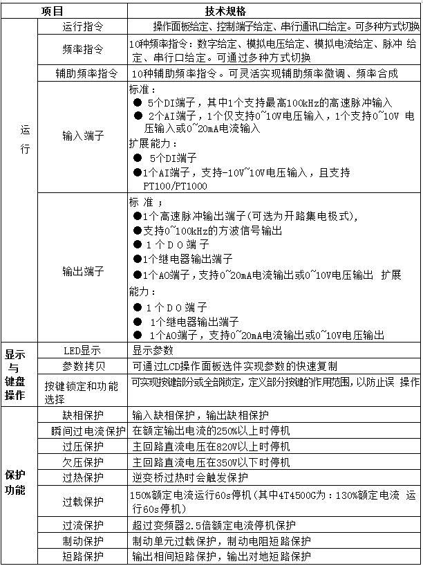本系列變頻器是一款通用高性能電流矢量變頻器主要用于控制和調節  三相交流異步電機的速度和轉矩。采用高性能的矢量控制技術低速高轉矩  輸出,具有良好的動態特性、超強的過載能力,性能穩定,保護功能強大, 人機界面簡潔、操作簡易。其廣泛應用于工業領域、制造業、軌道交通、能源與動力行業、造紙、拉絲、機床、包裝、食品、 風機、水泵及各種自動化生產設備的驅動。