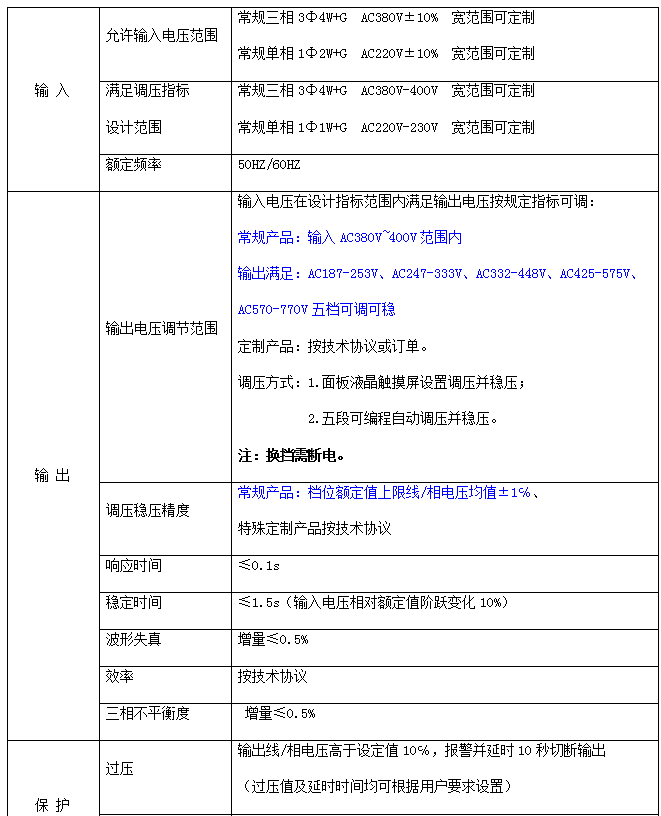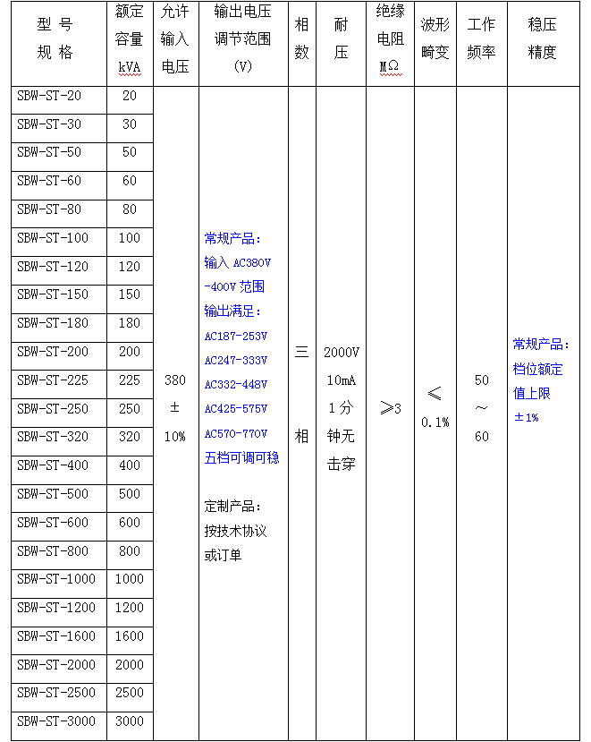 SBW-ST系列調壓穩壓器參數指標:所有參數皆可按需定制,以下常規僅供參考~